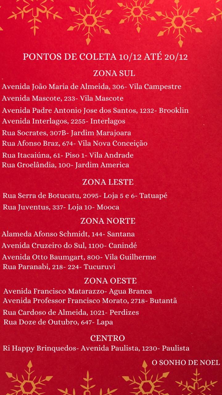 2º Apoiando: Viste o instagram dos padrinhos e embaixadores para entender ainda mais sobre a ação social “Sonho de Noel”. Se você conhece alguém que precise de receber essas doações fique com o radar ligado, o instagram do projeto anunciará os endereços correto dentro das comunidades do Paraisópolis, Heliópolis, Brasilândia e Jardim São Luís em breve.