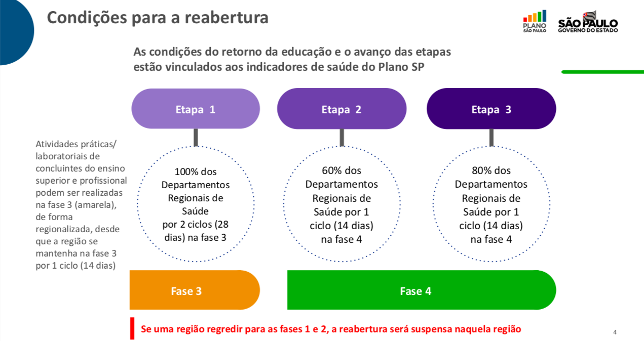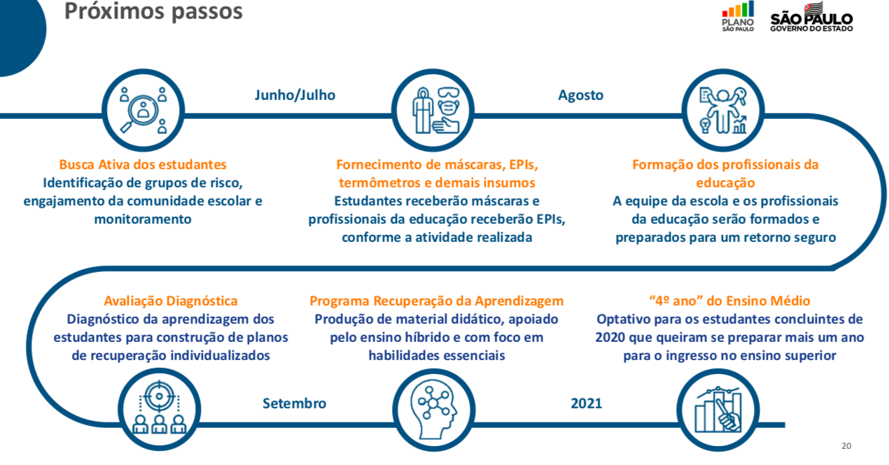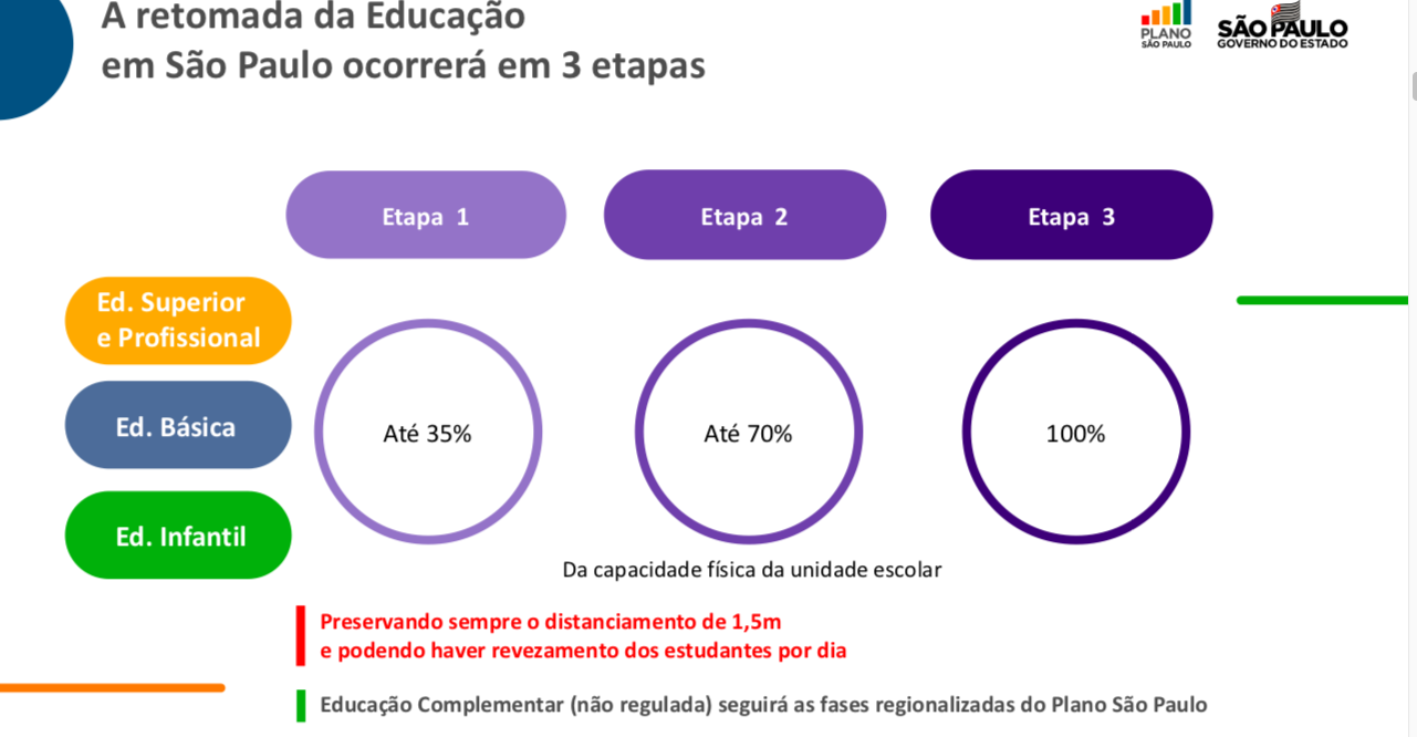 Segundo o governador de São Paulo João Doria (PSDB), o plano de retomada inclui protocolos de distanciamento social, monitoramento da saúde dos alunos, higiene pessoal e dos ambientes das escolas.